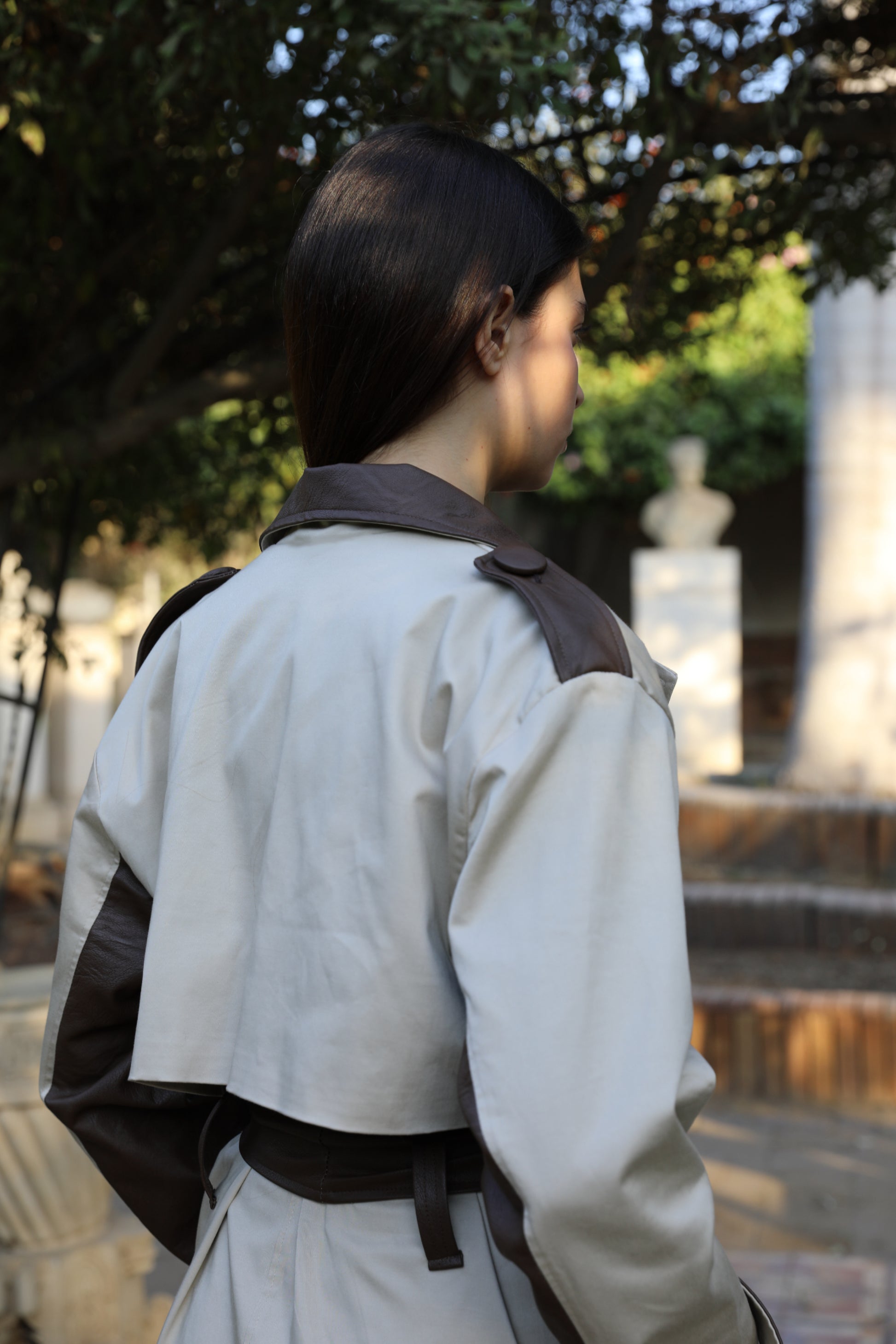 A structured jacket combining beige gabardine with brown leather details.